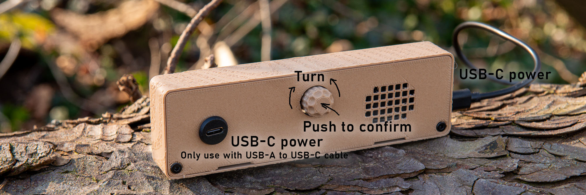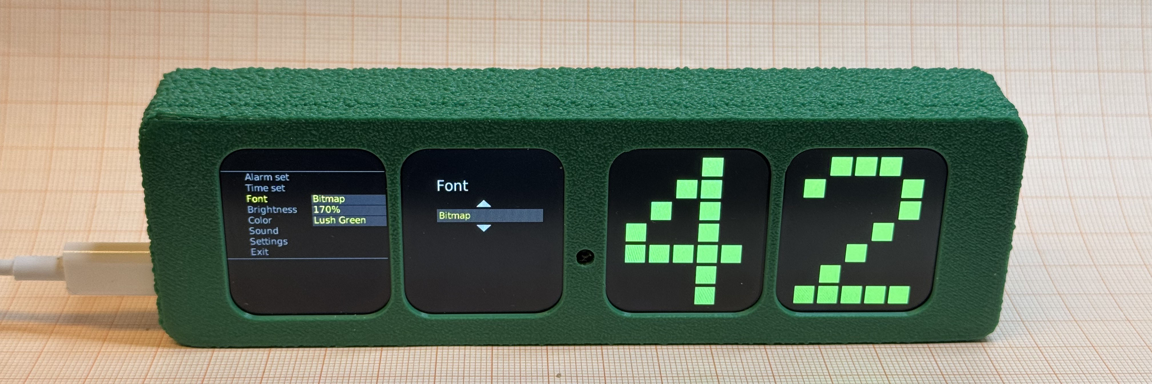 The QuadClock Bricta is powered via USB-C. Use a proper USB power adapter and cable (a simple 5V adapter will do). You can connect power either at the back or the side, whichever suits your setup best. Just don’t connect both at the same time. Note: the back USB-C port is compatible only with USB-C to USB-A cables. The side port it compatible with all USB-C cables.