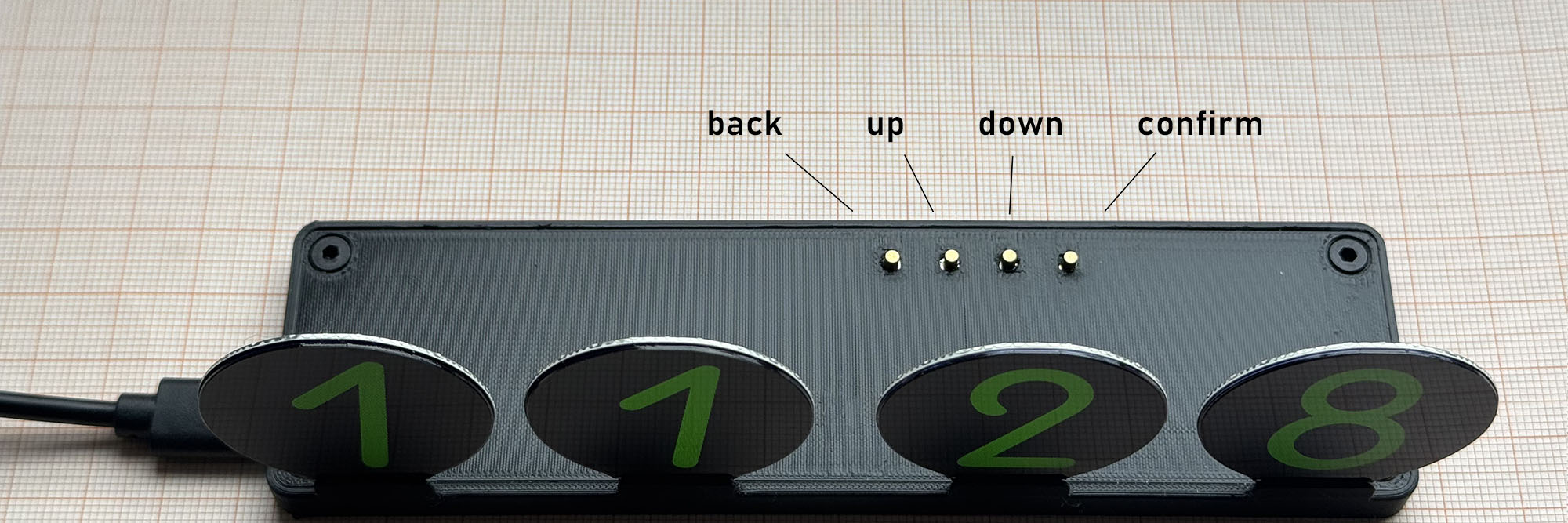 When the time is displayed, pressing the leftmost button switches on/off manual night mode: the display will dim to the lowest brightness and the color of the digits will turn to red. All sounds are muted (except for the timed alarms).