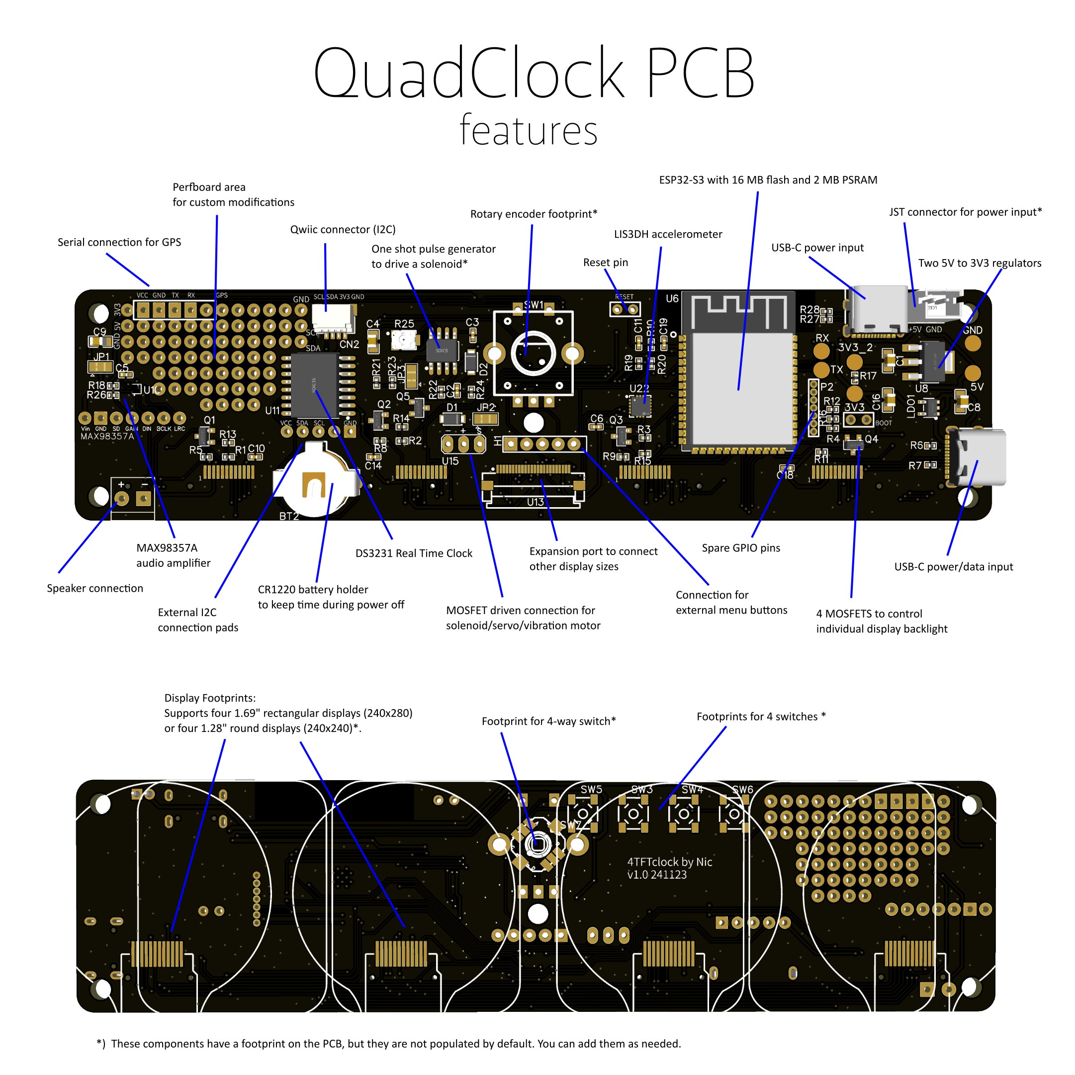 In short, the QuadClock PCB is a powerful ESP32-S3 platform built for four-TFT-display clocks. With its real-time clock, accelerometer, audio amplifier, and extensive expansion options, it’s a flexible base for all kinds of clock projects.