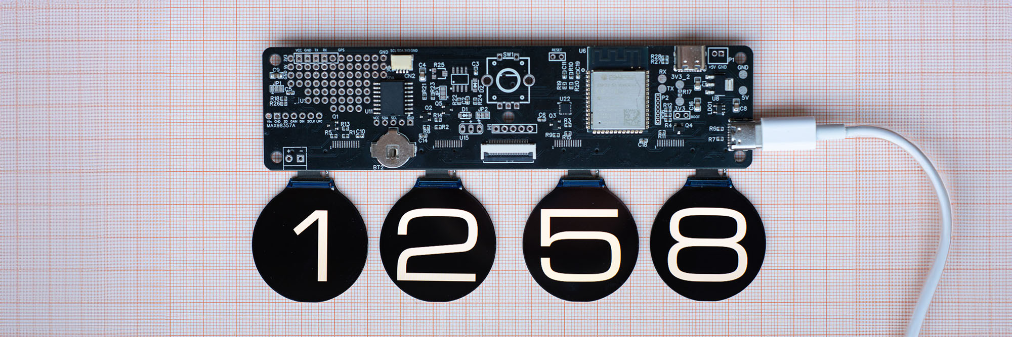 - Supports mounting of four 1.69" rectangular TFT displays (240x280) or four 1.28" round displays (240x240).